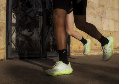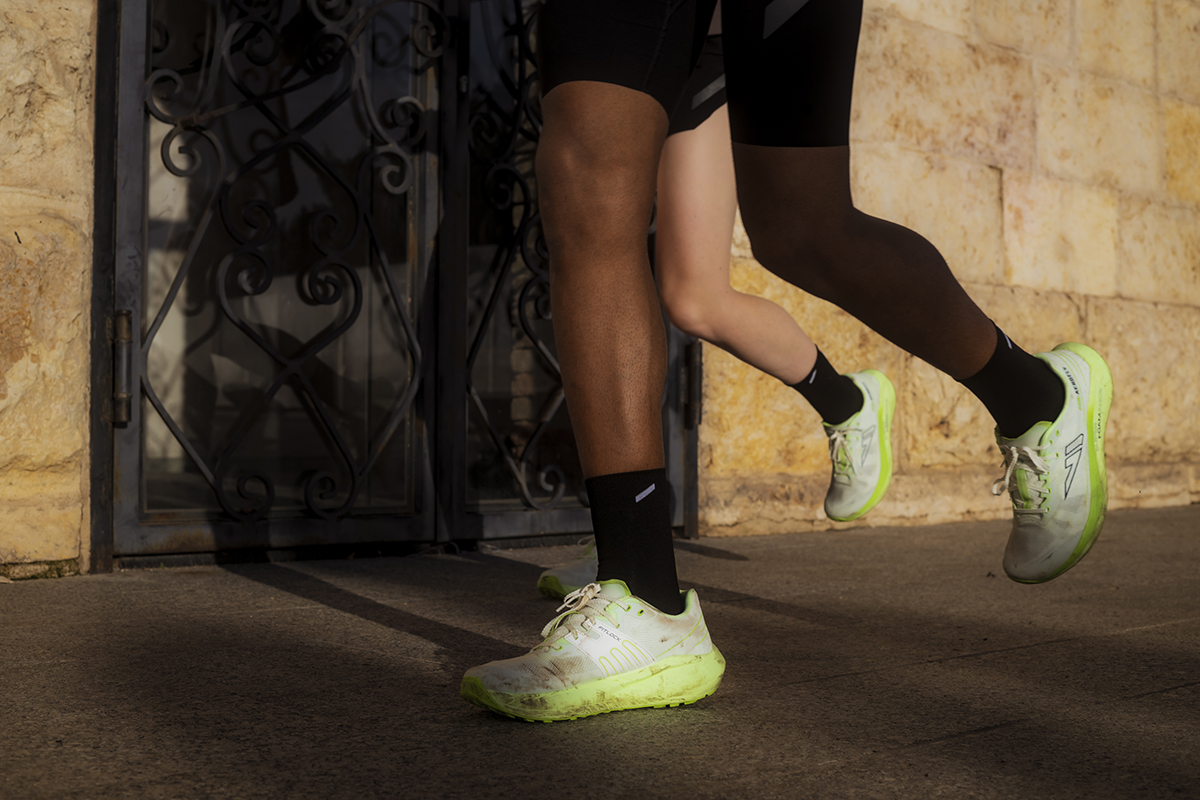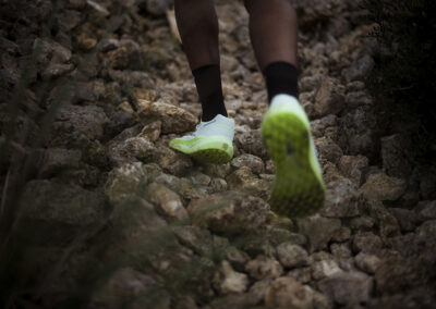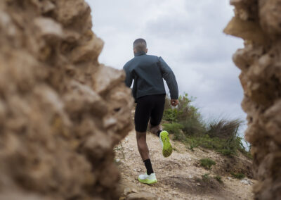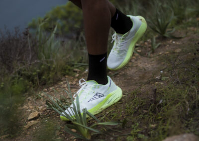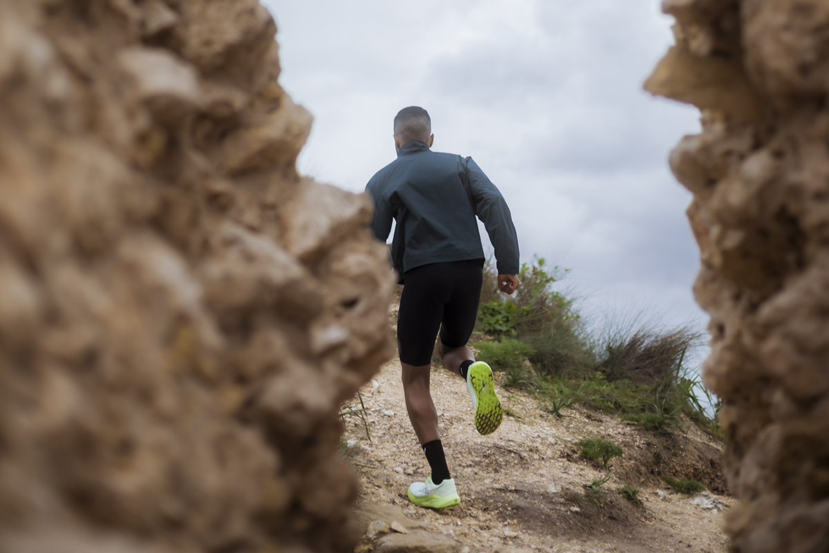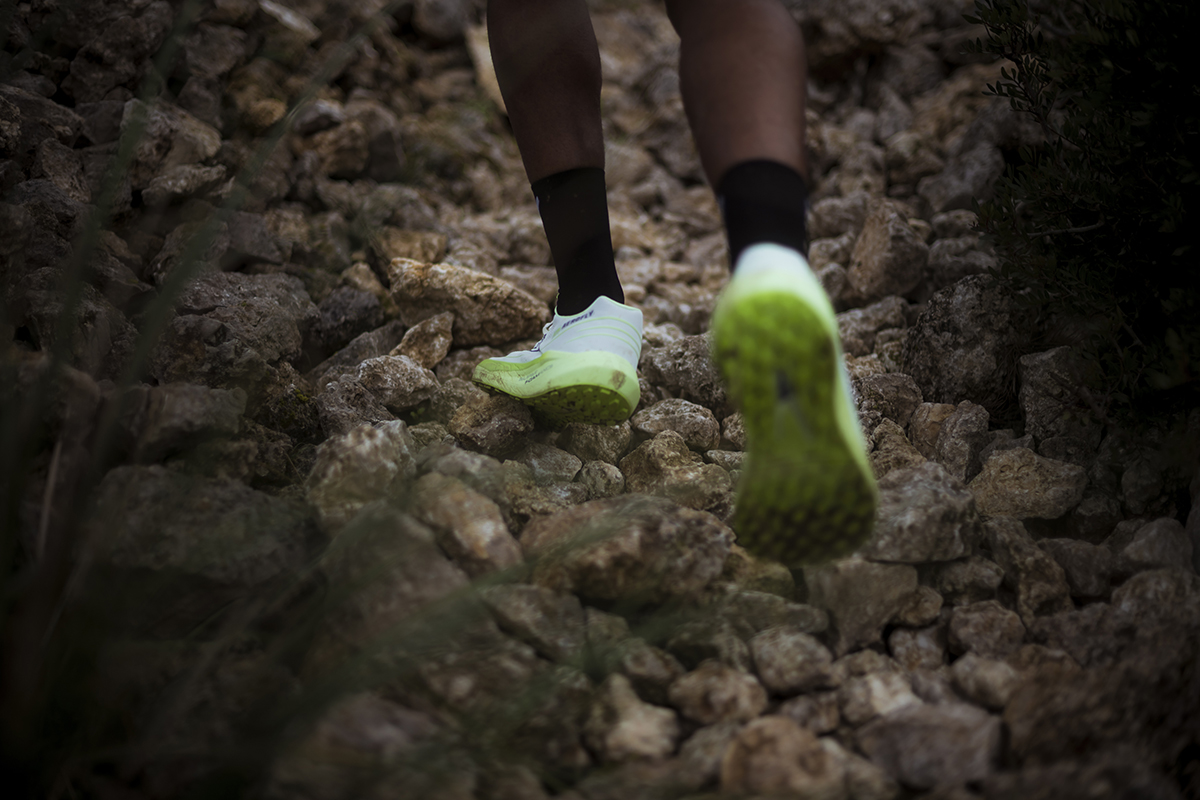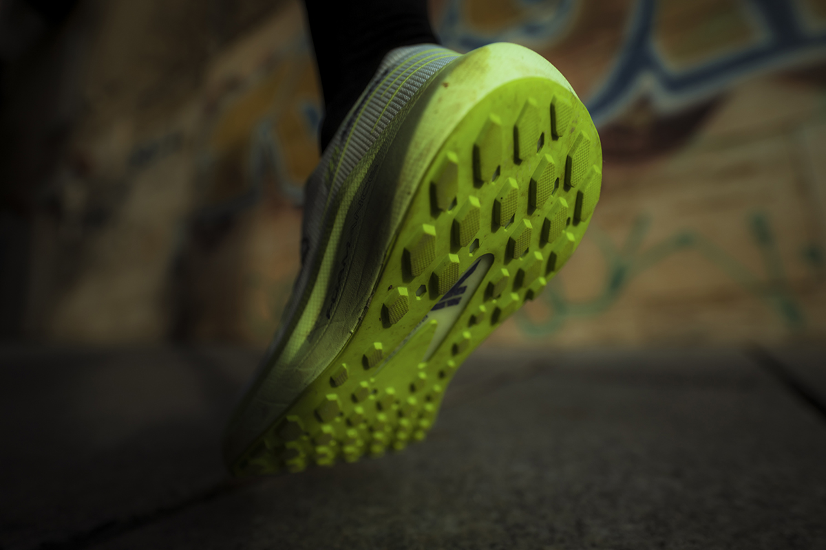 Il disegno dei tappi della suola deriva dalla necessità di consentire elevata scorrevolezza sui terreni duri come l’asfalto, ma anche di sfruttare al meglio le caratteristiche di tenuta grazie ai rombi da 3mm quando ci troviamo fuori strada. Un moderatore Rock plate in EVA ad alta intensità presente fra suola ed intersuola eleva la dinamicità della scarpa rendendola allo stesso tempo molto stabile.